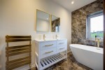 Bathroom featuring tiled flooring, tiled walls, walk in shower with drencher shower, modern roll top bath, double wash basins, toilet, heated towel rail, UPVC double glazed window with views.